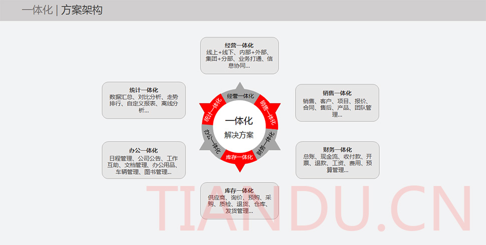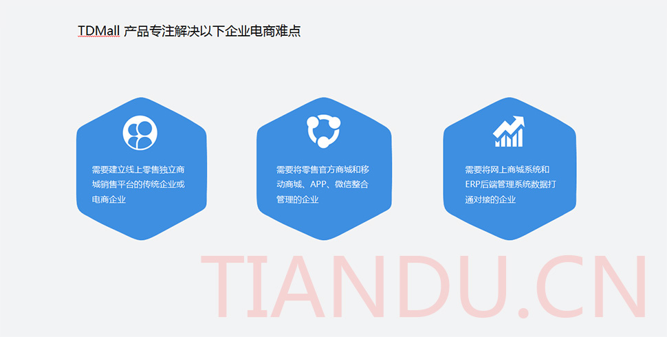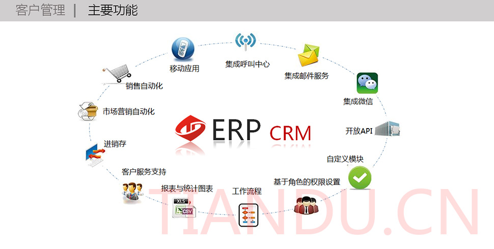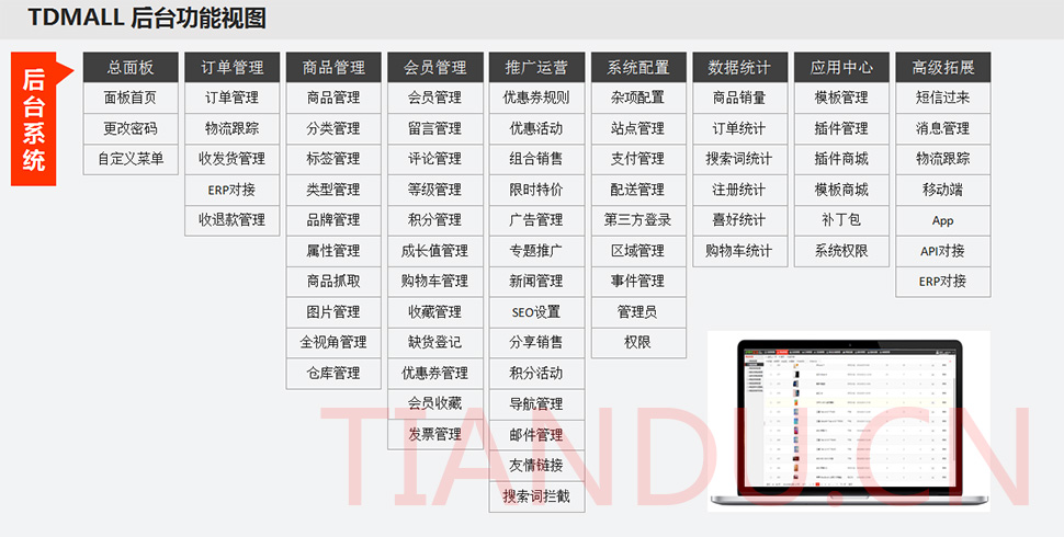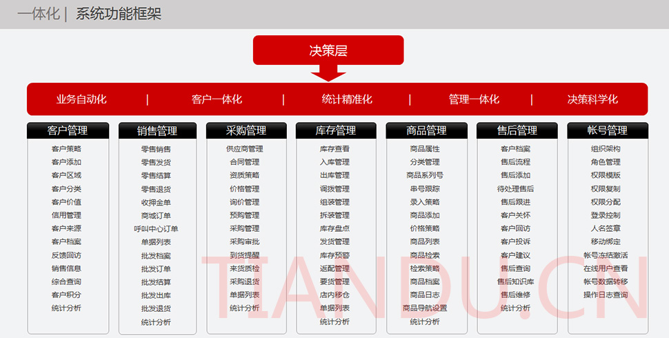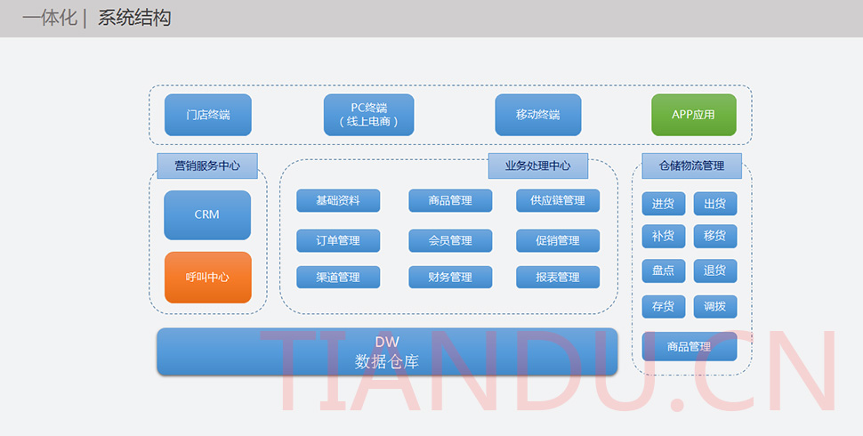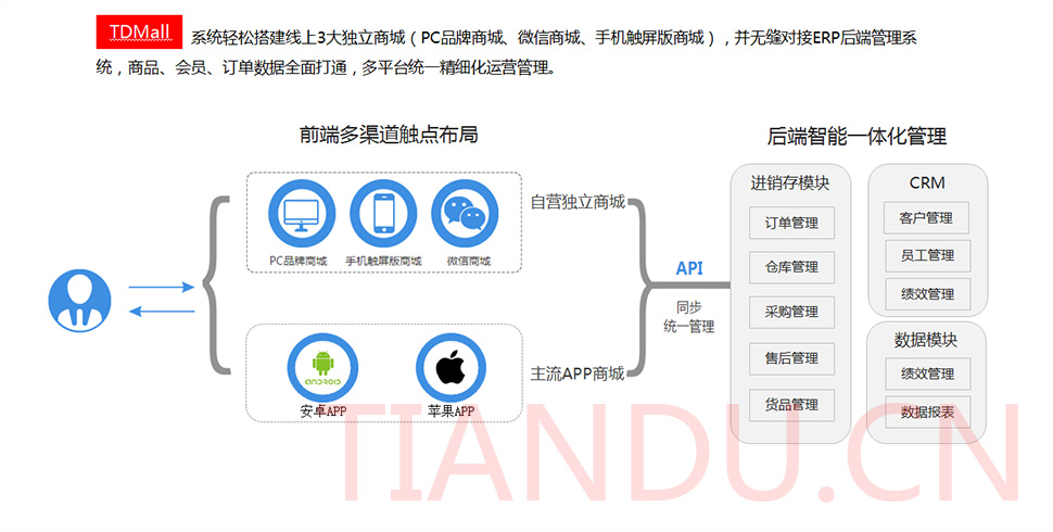 天度科技互聯研究院(博士后科研工作站)、天度軟件系統有限公司、天度科技股份有限公司合力近400人專業研發團隊,結合自身11年電子商務運營經驗,全力打造TDMALL電商ERP系統:整合電商網站平臺(PC版、觸屏版、微信版、APP版)、ERP企業資源管理系統、CRM客戶關系管理系統、財務管理系統、OA辦公系統和Call Center呼叫中心等系統,實現前端電商平臺及后端強大支撐系統的管理。