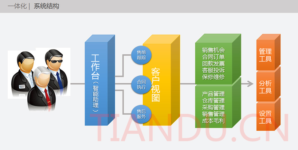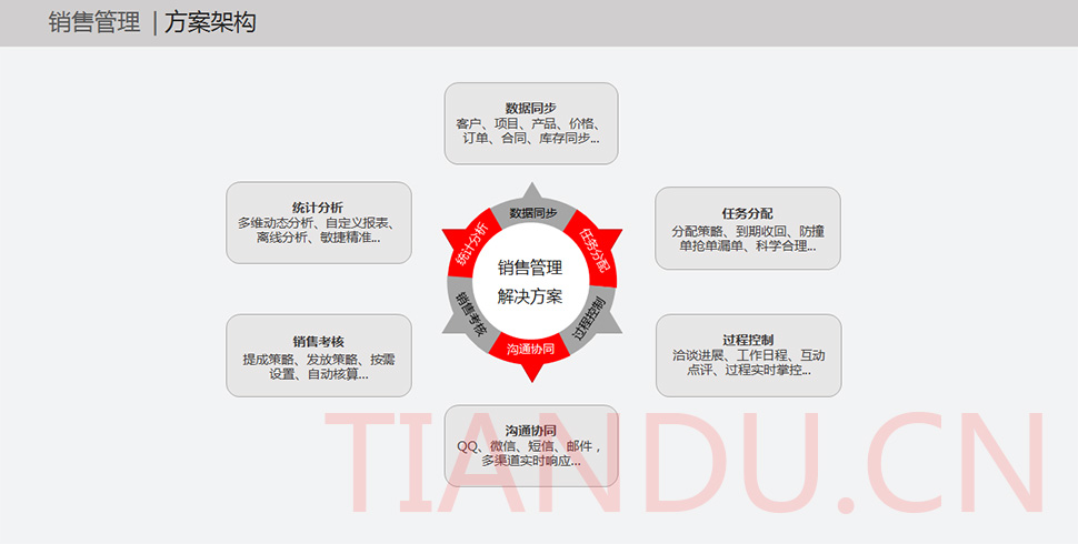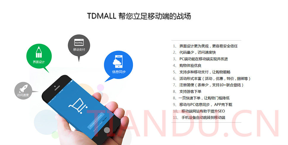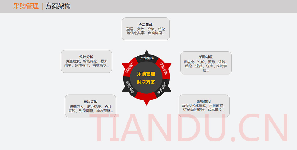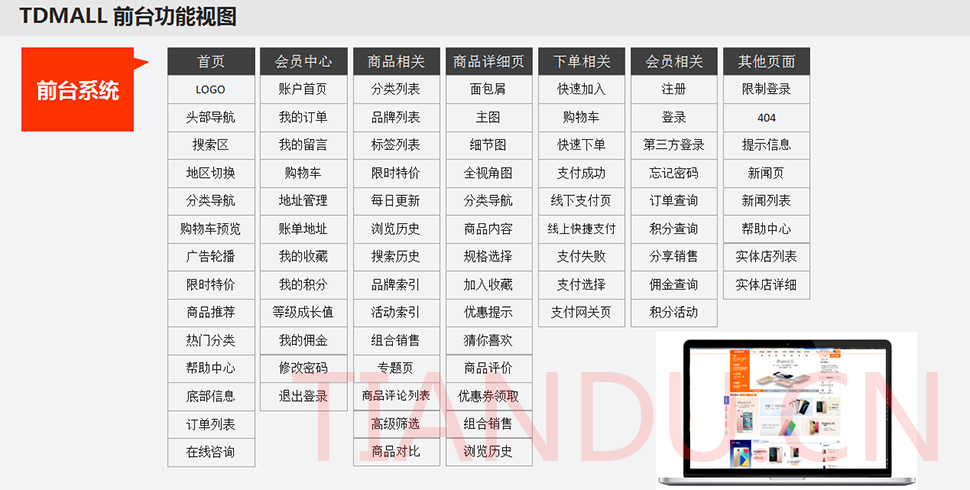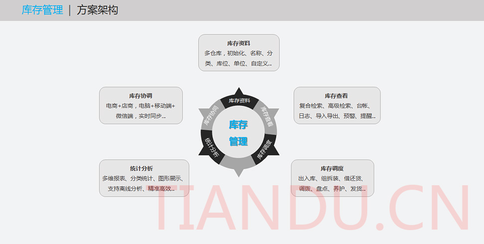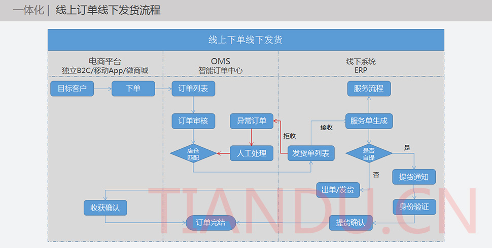 天度科技互聯研究院(博士后科研工作站)、天度軟件系統有限公司、天度科技股份有限公司合力近400人專業研發團隊,結合自身11年電子商務運營經驗,全力打造TDMALL電商ERP系統:整合電商網站平臺(PC版、觸屏版、微信版、APP版)、ERP企業資源管理系統、CRM客戶關系管理系統、財務管理系統、OA辦公系統和Call Center呼叫中心等系統,實現前端電商平臺及后端強大支撐系統的管理。