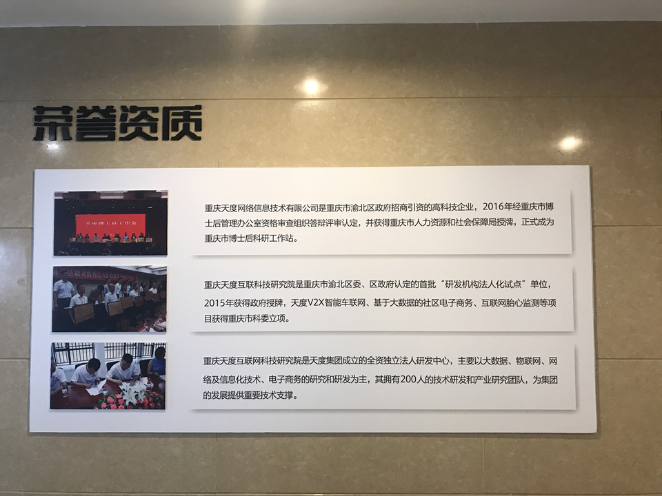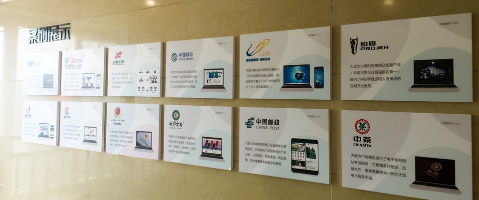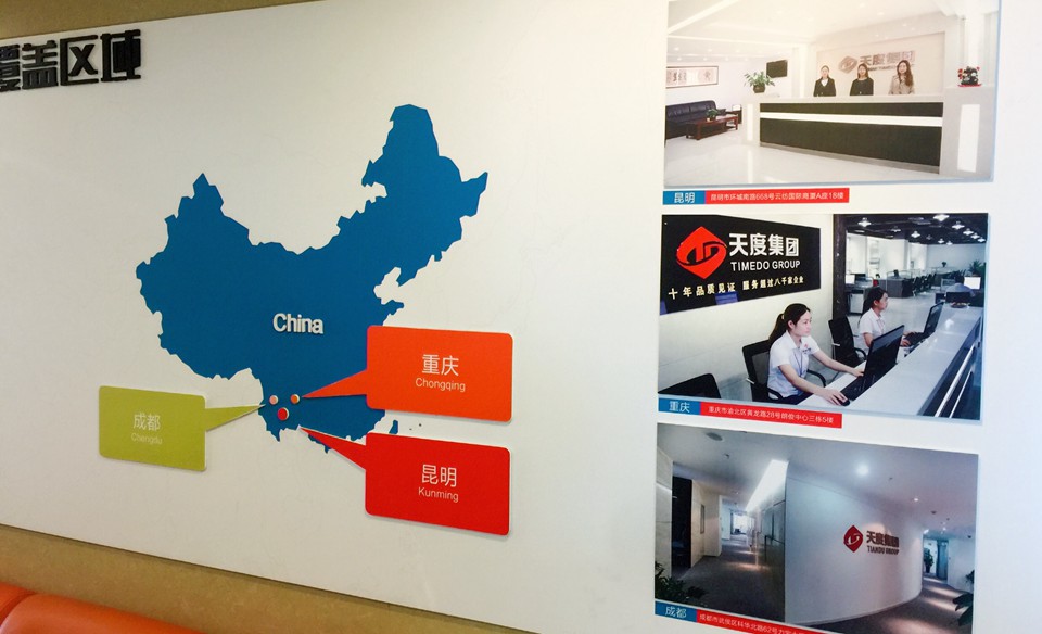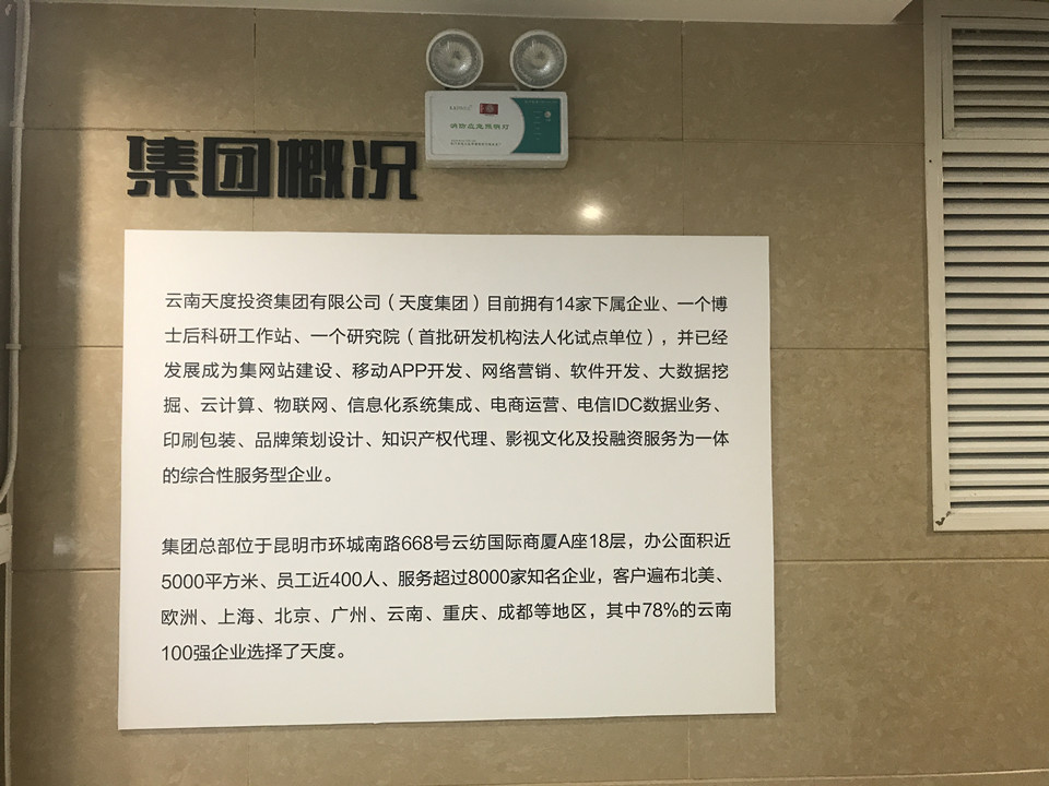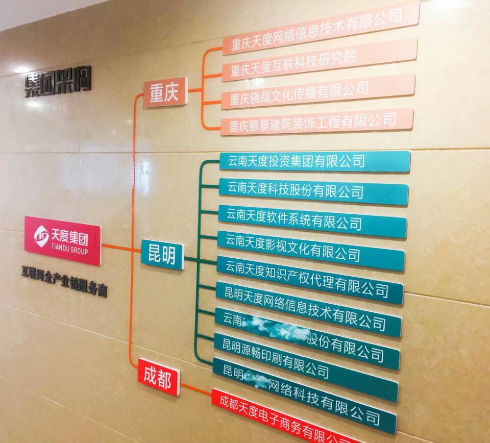 集團概況的文化墻對面就是咱們天度更詳細的“集團架構”,分別羅列出了重慶、昆明、成都三個總部的子公司,讓客戶對天度集團名下的子公司有更深入的認識,也從正面證明了天度12年積累下來的傲人的成果。