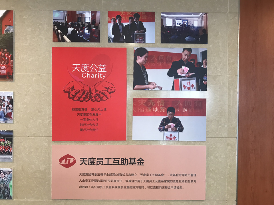 每一分榮譽證書的背后,都離不開為集團默默付出的員工。天度集團也珍視每一位員工,特別在集團內部設立“天度公益”,一個只屬于天度員工的互助基金,賬戶管理由全體員工投票選出三位同事擔任,當公司員工及家屬發生重病或災害時,可以直接向該基金申請救助!