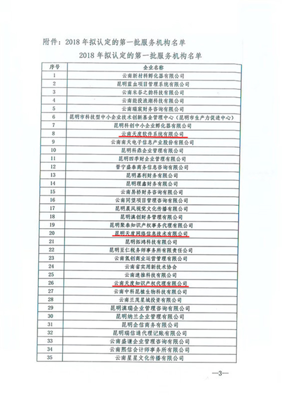天度集團旗下三家企業(yè)(昆明天度網(wǎng)絡信息技術有限公司、云南天度知識產(chǎn)權代理有限公司、云南天度軟件系統(tǒng)有限公司)為認定的“昆明市小微企業(yè)創(chuàng)業(yè)創(chuàng)新服務券服務機構”,咨詢熱線:0871-6899 8822。