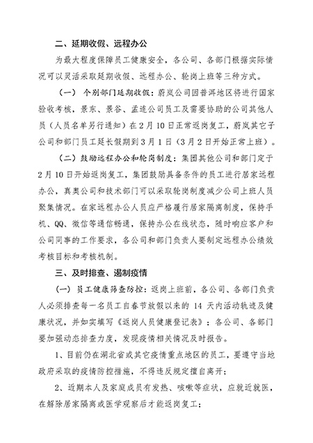 為最大程度保障員工健康安全,各公司、各部門根據(jù)實(shí)際情況可以靈活采取延期收假、遠(yuǎn)程辦公、輪崗上班等三種方式。