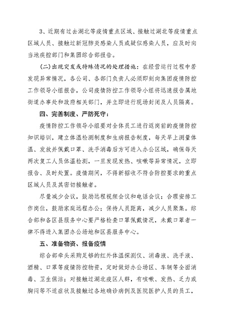 (二)出現(xiàn)突發(fā)或特殊情況的處理措施:在經(jīng)營運(yùn)行過程中若發(fā)現(xiàn)異常情況,各公司、各部門負(fù)責(zé)人必須即刻向集團(tuán)疫情防控工作領(lǐng)導(dǎo)小組報告,公司疫情防控工作領(lǐng)導(dǎo)小組將迅速報告屬地街道辦事處和政府相關(guān)部門,并立即進(jìn)行現(xiàn)場封閉及人員隔離。