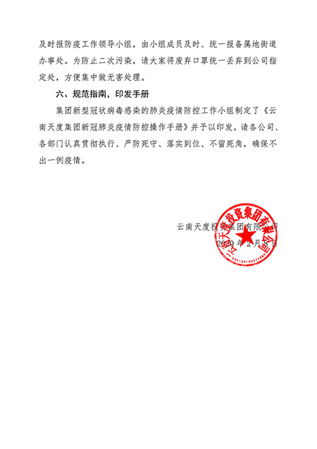 集團(tuán)新型冠狀病毒感染的肺炎疫情防控工作小組制定了《云南天度集團(tuán)新冠肺炎疫情防控操作手冊》并予以印發(fā),請各公司、各部門認(rèn)真貫徹執(zhí)行、嚴(yán)防死守、落實(shí)到位、不留死角,確保不出一例疫情。