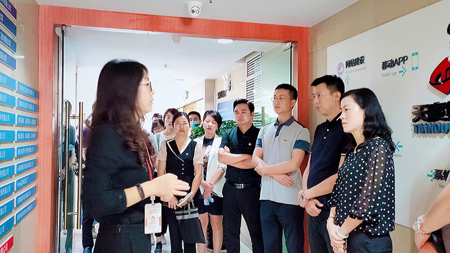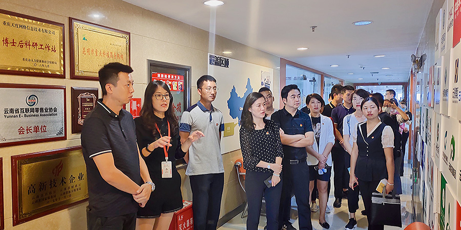 2020年7月7日下午,共青團臨滄市委書記丁玲一行15人在共青團昆明市委副書記林勤同志及共青團西山區委書記吳陽青同志的陪同下來到天度集團,圍繞青年電商創業、直播帶貨、電商扶貧等內容進行考察交流